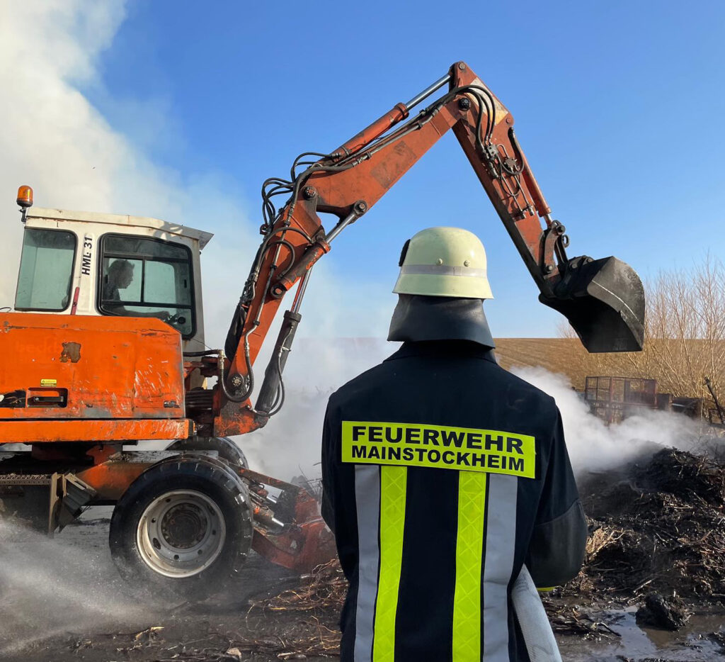 Das direkte Löschen des Grünguts wurde bereits zu Beginn als aussichtslos eingestuft und sich entschieden, dieses kontrolliert abbrennen zu lassen. Da die nächstgelegene Wasserentnahmestelle rund 850 m entfernt ist und das mitgeführte Löschwasser in beiden Fahrzeugen aus Mainstockheim lediglich 3.700 Liter beträgt, wurde umgehend die Feuerwehr Kitzingen zur Unterstützung beim Aufbau der langen Schlauchleitung sowie einem weiteren, 5.000 Liter umfassenden, Tanklöschfahrzeug nachalarmiert.