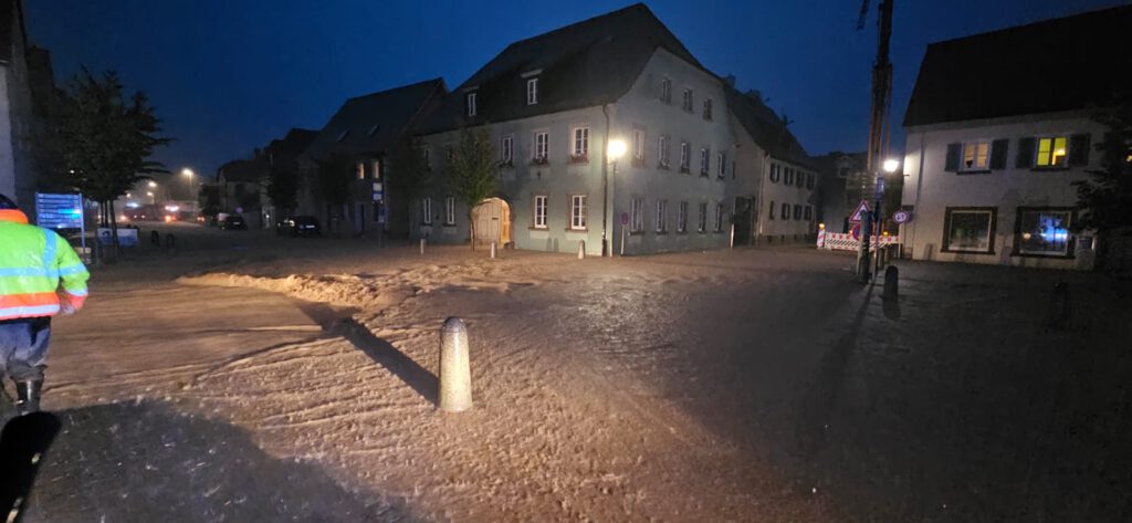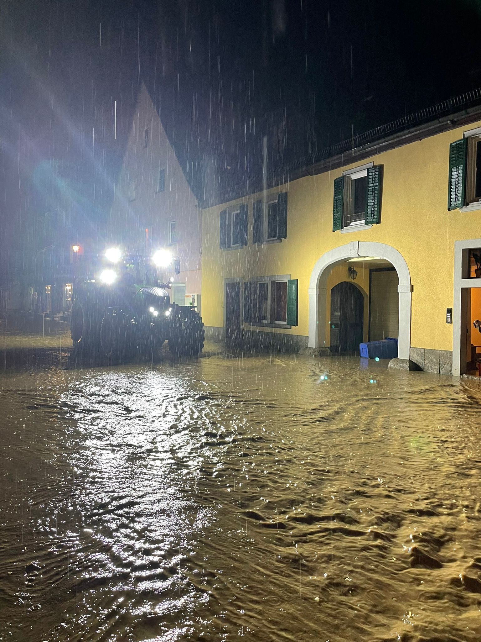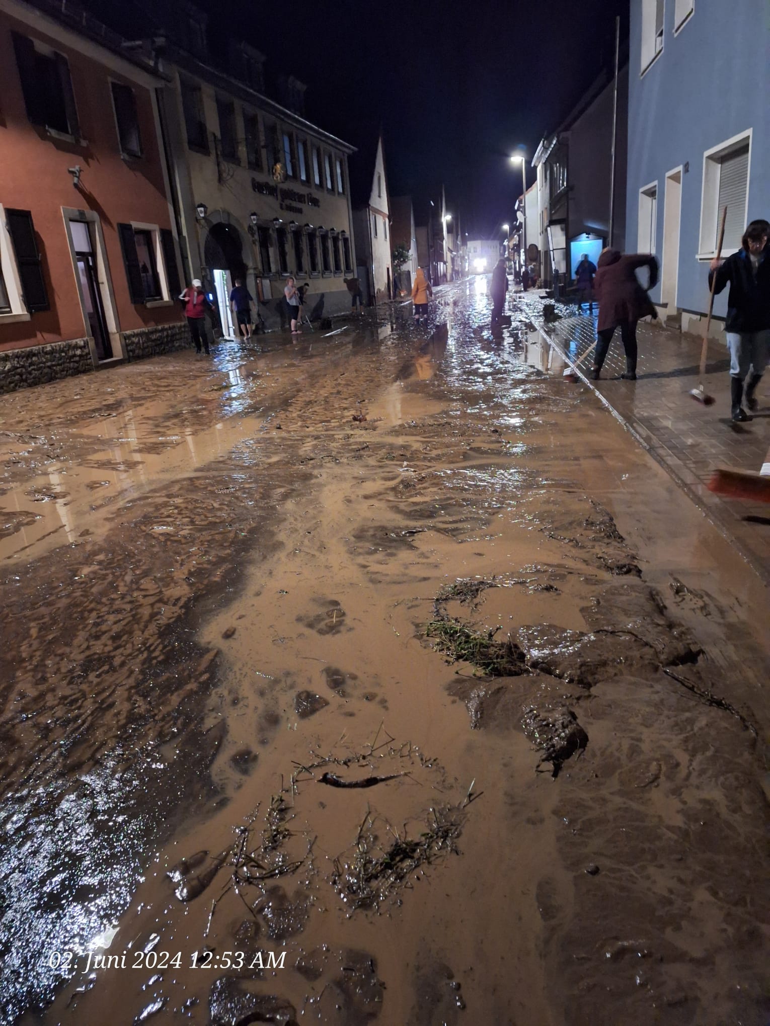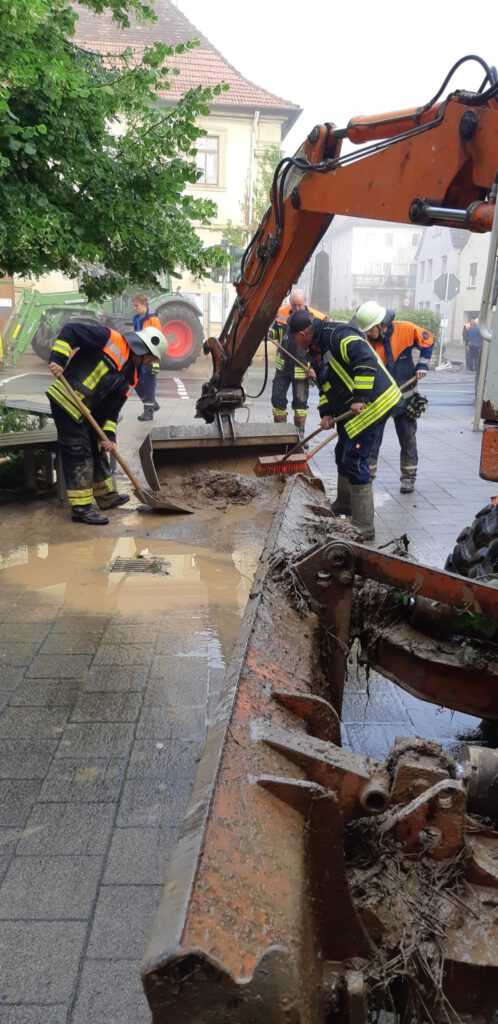 getreten ist und bereits großflächig die Hauptstraße ab Kreuzung Mühlweg in beide Richtungen flutet. Nach rund 20 Stunden Einsatz konnten über 40 Einsatzstellen abgearbeitet werden und, nachdem vollgelaufene Keller abgepumpt wurden, die betreffenden Straßenzüge von Schlammmassen gereinigt werden. Glücklicherweise erhielten wir um 3:44 Uhr Unterstützung durch die Feuerwehr Hörblach. Dazu an dieser Stelle nochmals vielen vielen Dank! Die letze Einsatzstelle des Tages konnten wir gegen 17:10 Uhr beenden. Damit war es aber leider noch nicht getan, den die Aufräumarbeiten beschäftigten uns noch die ganze Woche. Bedanken möchten wir uns bei unserer Bevölkerung, welche in Eigenleistung mit Familie, Freunden und Bekannten selbst Hand angelegt haben und uns somit eine Vielzahl weiterer Einsätze erspart haben. Auch der Firma Dorsch wollen wir für die Bereitstellung der Gerätschaften und der tatkräftigen Unterstützung danke sagen. Ein besonderer Dank gilt auch den Freiwilligen, die uns bei der Reinigung des eigenen Gerätehauses tatkräftig unterstützt haben! So konnte die eigene Mannschaft während dieser Zeit weitere Einsatzstellen abarbeiten.